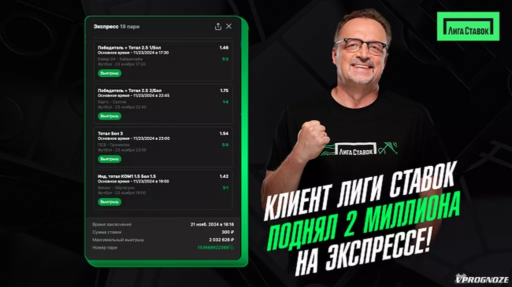 Коэффициенты на отдельные события варьировались от 1,42 до 1,75. При перемножении получился сумасшедший коэффициент 6 775, 42. Он поставил 300 рублей и выиграл внушительную сумму 2 032 626 рублей.