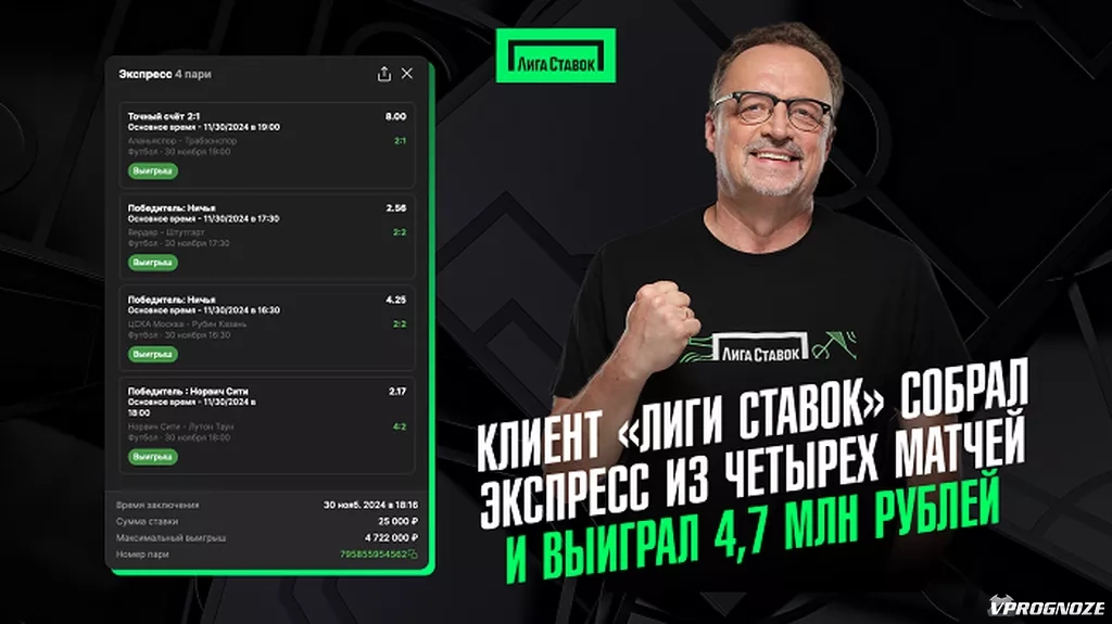Игрок поставил 25000 рублей. Он включил в свой экспресс матч «Аланьяспор» — «Трабзонспор» из турецкой Суперлиги, «Вердер» — «Штутгарт» из Бундеслиги, «Норвич Сити» — «Лутон Таун» из Чемпионшипа, а также ЦСКА — «Рубин» из нашей РПЛ. В матче турецкой Суперлиги игрок поставил на точный счет 2:1 в пользу «Аланьяспора» за солидный коэффициент 8,00. В игре «Вердера» и «Штутгарта» был выбран ничейный исход. После 1-го тайма коэффициент составлял 2,56. Не обошлось и без удачи. Ничейный счет между «Норвичем» и «Лутоном» держался до 80-й минуты, пока хозяева не забили два гола подряд. На победу «Норвича» в лайве был коэффициент 2,17. А в матче ЦСКА — «Рубин» гол в компенсированное время Матвея Лукина спас клиента от проигрыша ставки. В лайве, при счете 1:2 в пользу «Рубина», он поставил на ничью за 4,25.