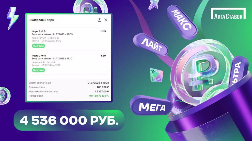Клиент «Лиги Ставок» заключил идентичные пари на матчи первого круга Уимблдона между Хиджикатой и Гоффином, а также Комесаньей и Муту. Беттор взял победу Хиджикаты и Муту с итоговой разницей в 7 и больше выигранных геймов (фора -6,5) за коэффициенты 3,15 и 3,60 соответственно. Хиджиката обыграл Гоффина 3:0. Муту также уверенно одолел Комесанью 3:0.