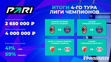 Самым популярным событием 4-го тура стал матч «Милан» — «ПСЖ», на который приходится 11% общей доли оборота ставок на встречи 4-го тура Лиги чемпионов. В этой игре «россонери» смогли отомстить парижанам за октябрьское поражение, обыграв их со счетом 2:1. Тем не менее миланцам придется как следует постараться в следующих турах, чтобы выйти из группы, — сейчас команда занимает третье место в своем квартете.