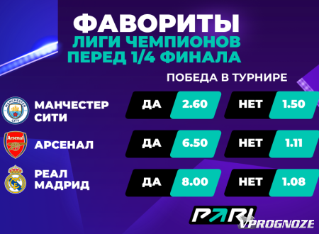 По оценкам аналитиков PARI, главный претендент на победу в Лиге чемпионов — действующий победитель турнира «Манчестер Сити». Сделать ставку на то, что команда Пепа Гвардиолы успешно проведет защиту титула, можно по коэффициенту 2.60. Котировки на выход англичан в финал составляют 1.90. В четвертьфинале «Ман Сити» сыграет с мадридским «Реалом». Триумф испанского клуба в турнире можно спрогнозировать за 8.00. В противостоянии «Сити» и «Реала» букмекеры предлагают коэффициент 1.48 на англичан и 2.65 — на испанцев.