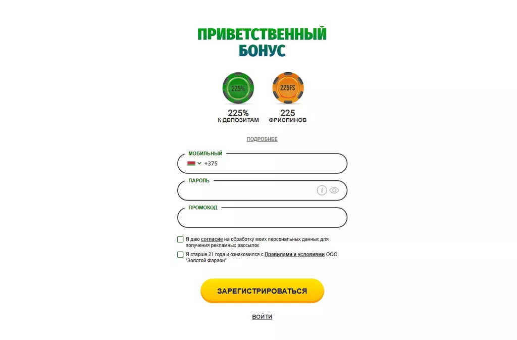 - Дать согласие на обработку персональных данных, прочитать правила владельца БК ООО «Золотой Фараон».