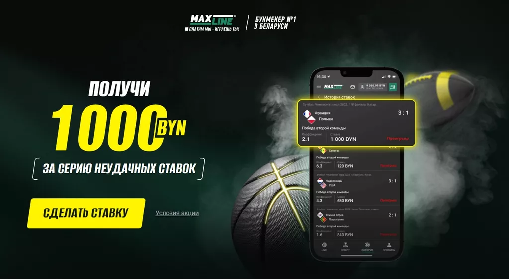 Maxline возвращает на призовой счет болельщиков до 1000 BYN за 10 подряд неудачных пари с максимальной котировкой 3.00. Утешительный приз доступен для отыгрыша на исходах с котировками от 1.60. Выигрыш от сделки поступает на основной баланс игрока в полном объеме.