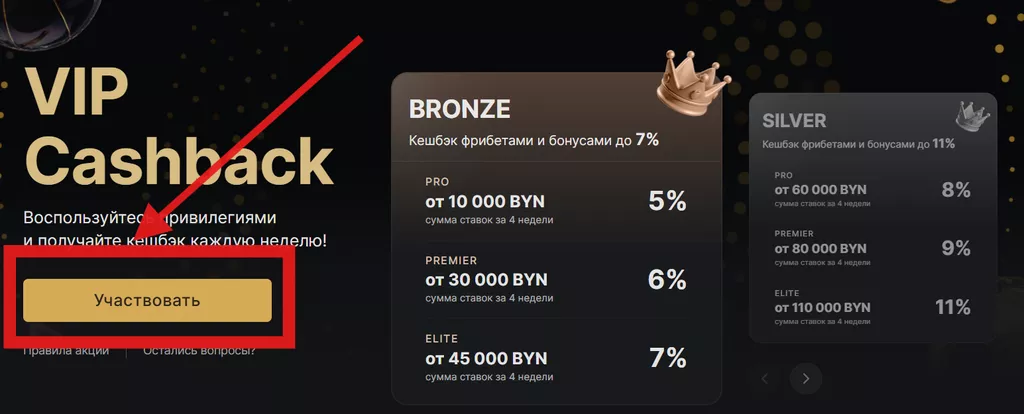 Online-сервис возвращает клиентам до 20% проигранных в течение недели денег в виде фрибета или зачисления на основной баланс. Сумма выплат зависит от статуса пользователя в программе лояльности и объема убытка.