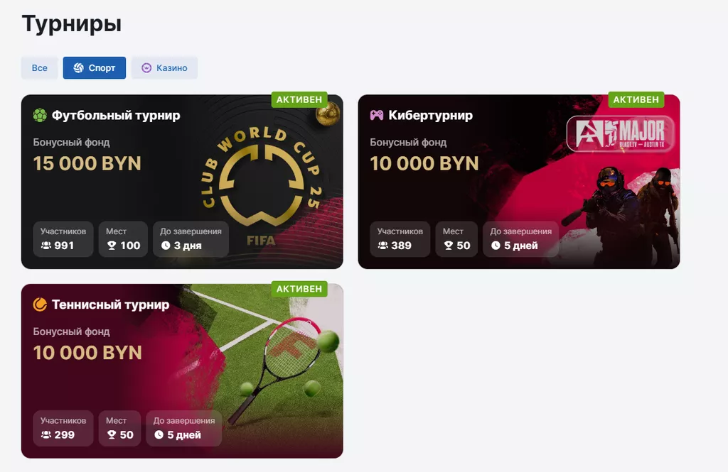 - максимальная награда – 2500 BYN в теннисе, 2000 BYN – в киберспортивных и футбольных соревнованиях.
