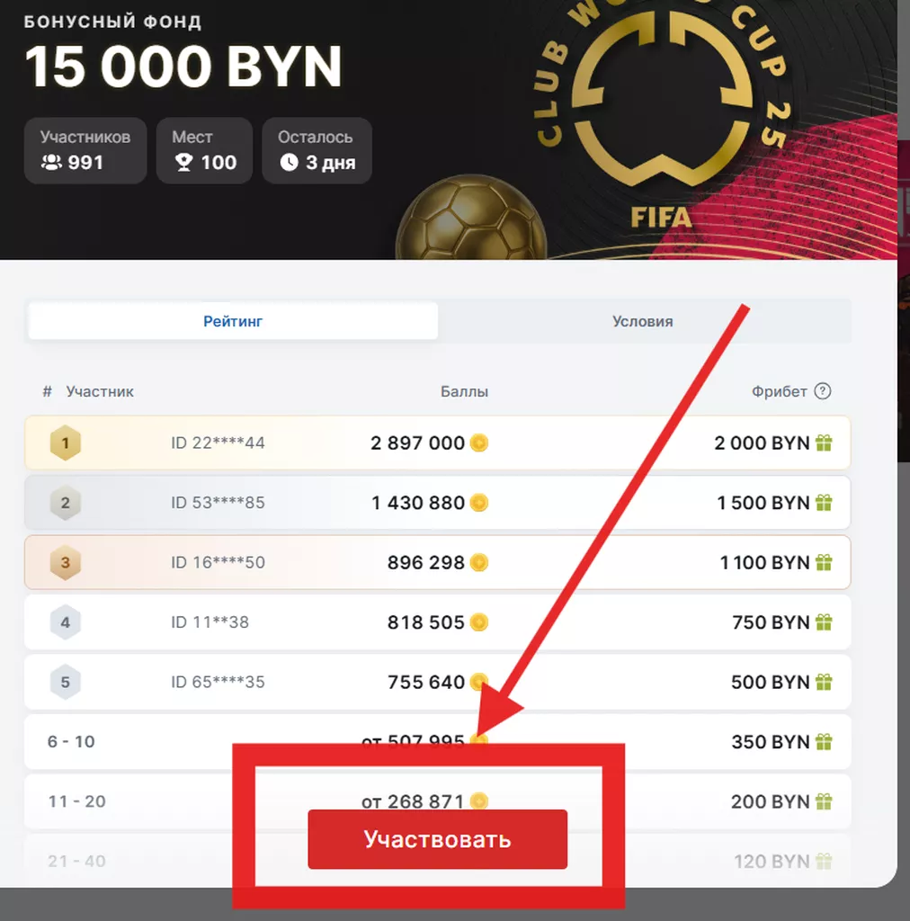 Минимальный суммарный объем пари для участия – 10000 руб.