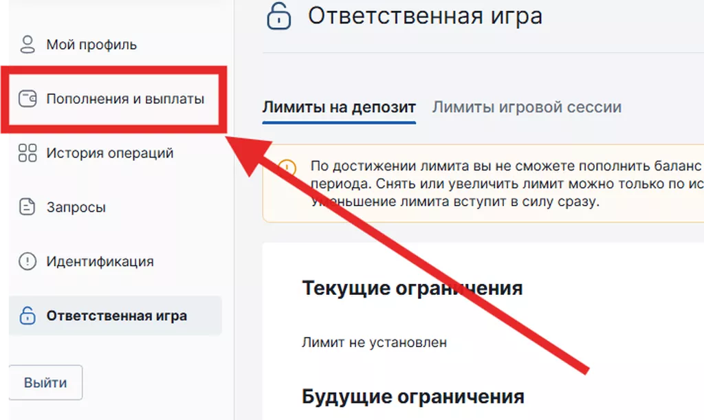 - Выбрать раздел «Пополнения и выплаты».