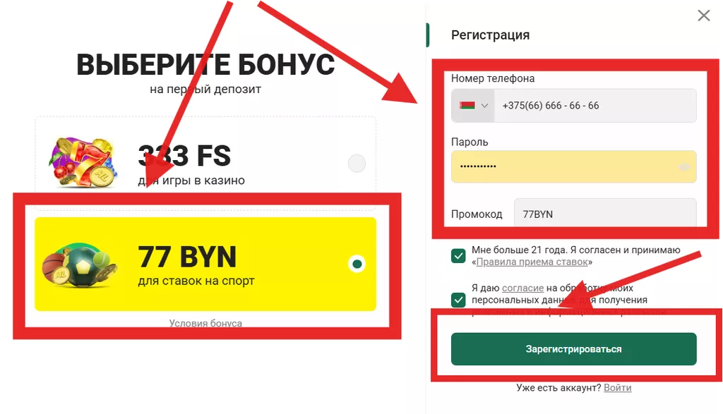 - выбрать бонус во время регистрации;