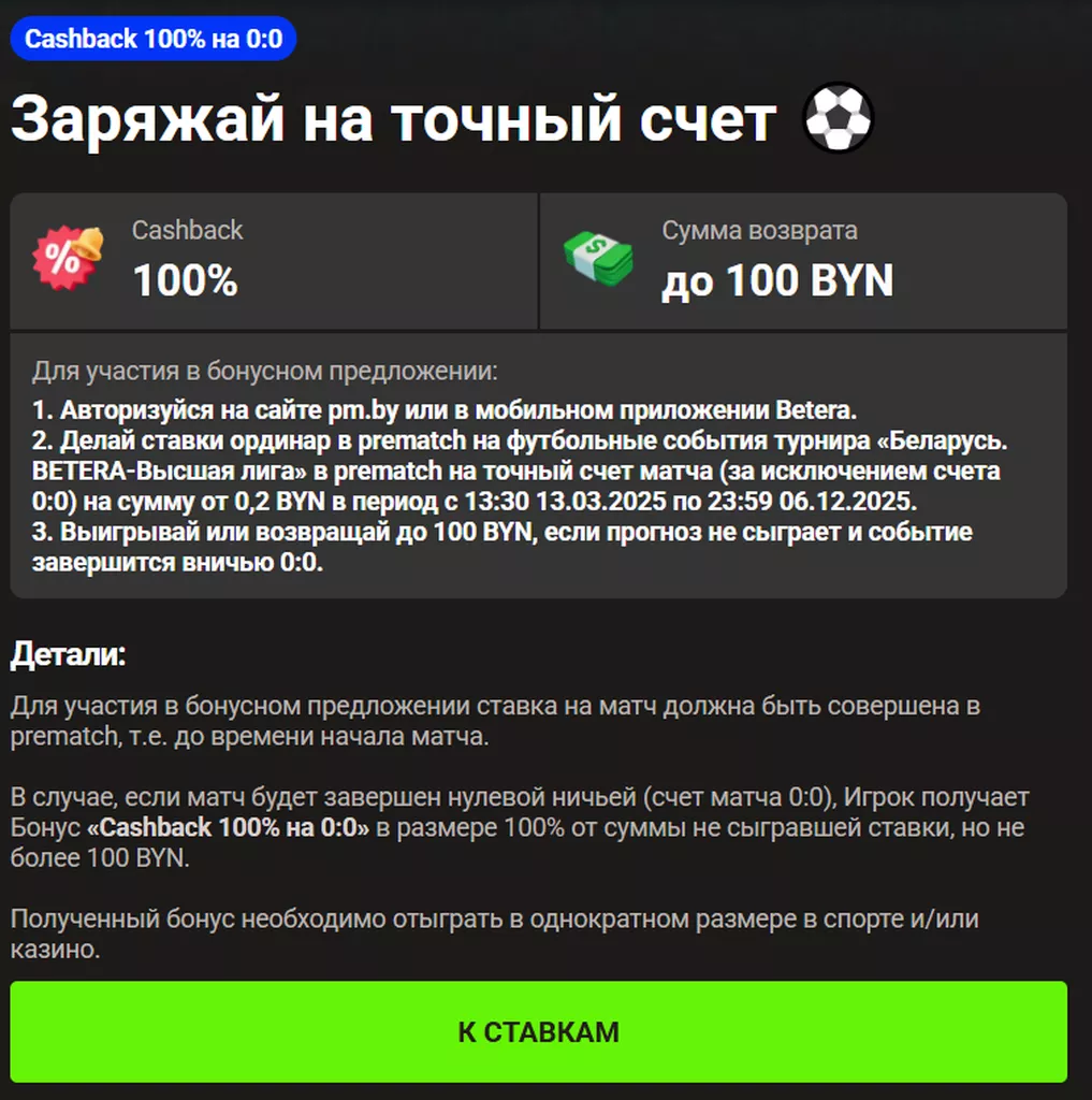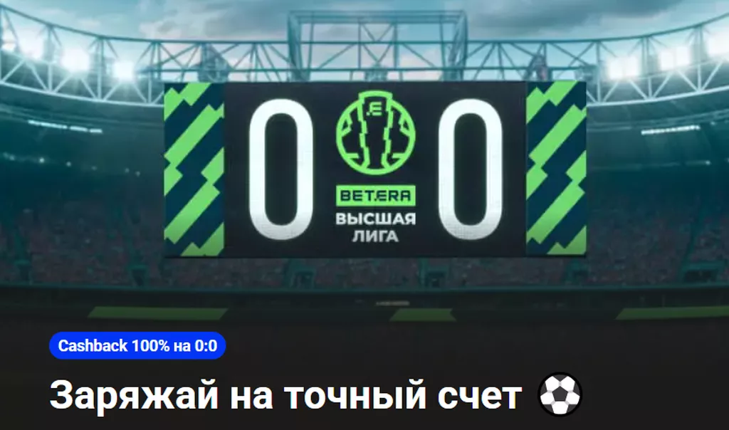 В Бетера застраховать ставку от проигрыша можно при размещении пари на матчи футбольной Высшей лиги Беларуси. Для участия в промо необходимо поставить на точный счет. При нулевой ничьей и проигрыше купона букмекер вернет 100% потерянной суммы. Максимальное вознаграждение – 100 BYN. Сумма акционного пари – 0,2 BYN.