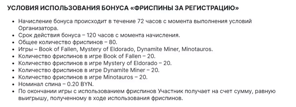 Номинал 1 бесплатного вращения – 0,2 руб. Пользователь получает по 20 фриспинов в игровых автоматах Book of Fallen, Mystery of Eldorado, Dynamite Miner, Minotauros.