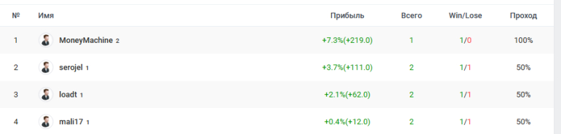 ИТОГИ_7 тур 16,78 - Железяка (9 из 9) 4,44 - Мятые предикторы (9 из 9) 4,37 - Убийцы тм-ов (9 из 9) 3,77 - Кони в яблоках! (9 из 9) 3,04 - Только Верняк (9 из 9) 1,16 - Разрушители (7 из 7) -0,22 - Наглецы (9 из 9) -0,54 - Thong (9 из 9) -2,64 - Киберкотлеты (6 из 6) -4,79 - missclick (5 из 5)...