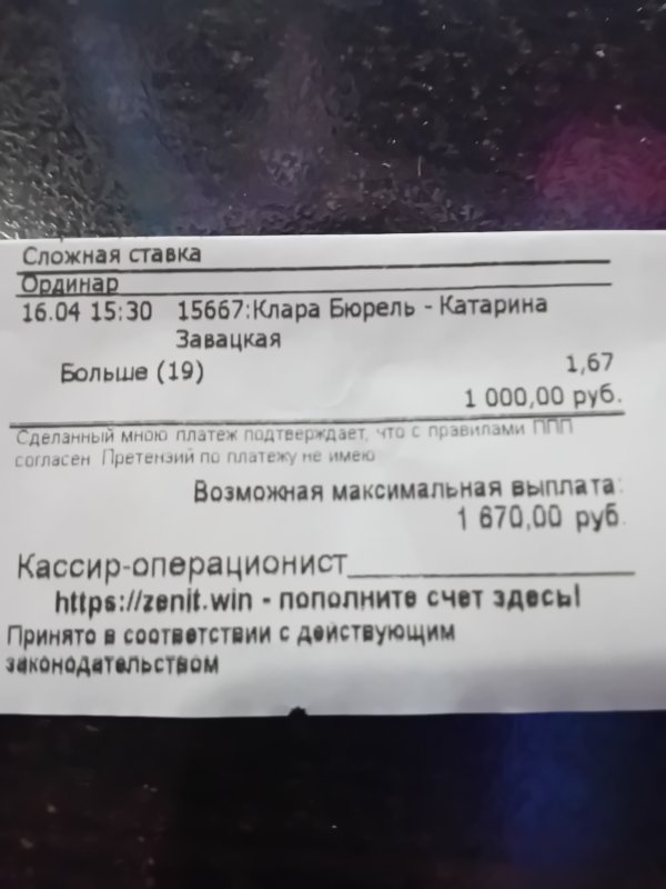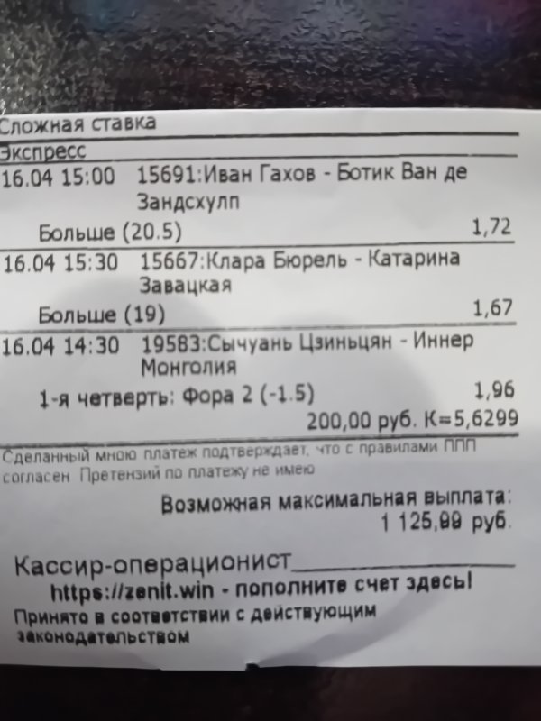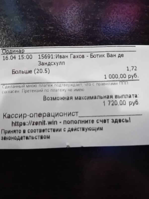 У тебя будка рядом? Онлайн вообще не ставишь?Гондурашко, друг, ну ты же видел: все разы ранее, что выкладывал чеки, - хрен зашли, хотя по ходу матча вели-перевели.Иногда думается, что это мистика какая-то.