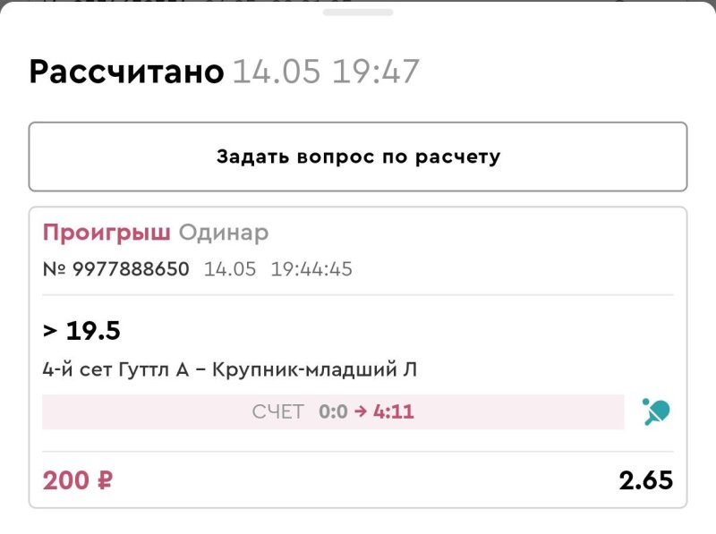 Потом, что немаловажно – какой именно сет берется для ставки на ТБ? Первый, второй, может, только решающий пятый? От этого ведь сильно зависит логика игры и, соответственно, тотал. В вашей таблице эта конкретика не указана. Вот, к примеру, смотрю матч Крейчи и Шведика, который они сыграли 24 мая 2024 года, счет по сетам: 11–3, 11–9, 5–11, 11–7. По вашей таблице видно, что ставка на ТБ 19,5 очков у вас проиграла только в четвертом сете(18). А в первых трех, где тотал 14, 20 и 16, ставка тоже была? Тут не совсем понятно, если честно. ИИ, конечно же! Сидит на ютубе и смотрит!