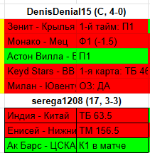 Поэтому я и добавил только 1-й сет в теннисе и матчи взял не слишком поздние, т.к. вероятность выше, что хотя бы один сет они сыграют, а потом уже либо перенесут, либо у кого-то заболит пятка и т.д.