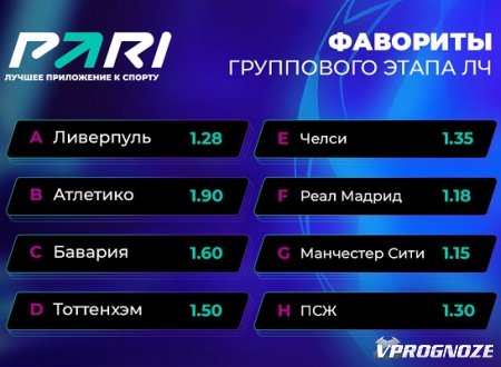 Группа H: «ПСЖ» (1.30), «Ювентус» (4.00), «Бенфика» (13.00), «Маккаби Хайфа» (150.00).