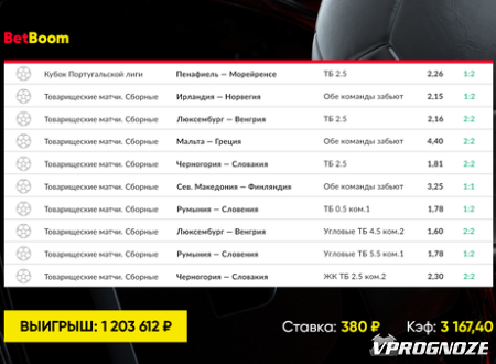 Тревожным матчем в купоне было товарищеское противостояние сборных Румынии и Словении. Клиент BetBoom поставил на тотал угловых ударов хозяев больше 5,5. Сборная Румынии смогла реализовать всего шесть угловых. Ставка беттора зашла, но не без нервов для него самого.