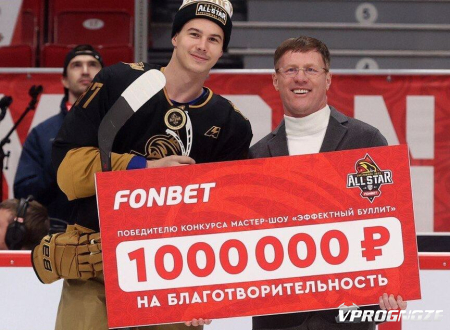 В рамках проведения Фонбет Недели звезд хоккея генеральный директор Фонбет Сергей Анохин вручил чек на один миллион рублей Николаю Голдобину, победителю конкурса на самый красивый буллит. Игрок сможет перечислить деньги любому благотворительному фонду на свой выбор.