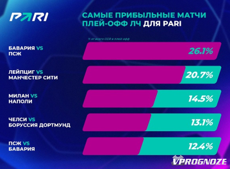 Любопытно, что самым прибыльным матчем плей-офф ЛЧ для PARI оказалась битва «Баварии» и «ПСЖ», завершившаяся победой хозяев со счетом 2:0. Клиенты ожидали, что парижане хотя бы забьют, но «Бавария» была непреклонна. В пятерку самых удачных игр для букмекеров также вошли «Лейпциг» — «Манчестер Сити», «Милан» — «Наполи» (1:0), «Челси» — «Боруссия» (2:0) и «ПСЖ» — «Бавария» (0:1). В свою очередь, клиенты больше всего заработали, обыграв PARI, на матчах «Ливерпуль» — «Реал» (2:5), «Айнтрахт» — «Наполи» (0:2) и «Брюгге» — «Бенфика» (0:2).