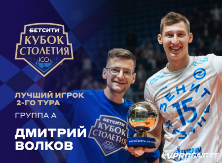 В Казани завершился групповой этап БЕТСИТИ Кубка Столетия по волейболу. Доигровщик «Зенит-Казань» Дмитрий Волков признан лучшим игроком второго тура БЕТСИТИ Кубка Столетия в группе А.