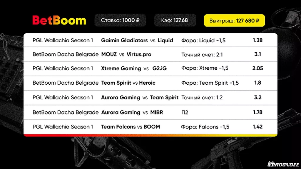 Клиент букмекерской компании BetBoom собрал киберспортивный экспресс с коэффициентом 127.68 — он ставил на матчи PGL Wallachia Season 1 по Dota 2 и BetBoom Dacha Belgrade по CS 2. Беттор выиграл 127 680 рублей, поставив всего 1000.