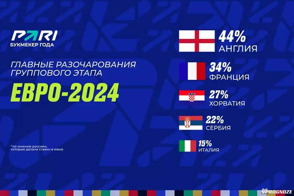 Букмекерская компания PARI провела исследование среди российских игроков на ставках и узнала их мнение о чемпионате Европы по футболу, который проходит в Германии с 14 июня по 14 июля. Участники опроса назвали сборную Англии главным разочарованием группового этапа Евро-2024.