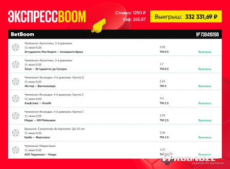 Экспрессы – это очень рисковый вид пари, но когда они заходят, радости игроков нет предела. BetBoom на регулярной основе публикует успешные экспрессы с большими коэффициентами. На прошлой неделе наш клиент выиграл больше 300 тысяч рублей с одного экспресса!