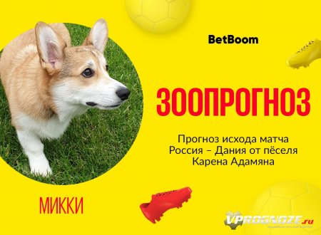 Зоопрогнозы от BetBoom продолжаются. В этот раз корги амбассадора BetBoom Карена Адамяна предсказывал результаты матча Россия - Дания. По мнению питомца ведущего «Матч ТВ», победу в этом матче одержат датчане.