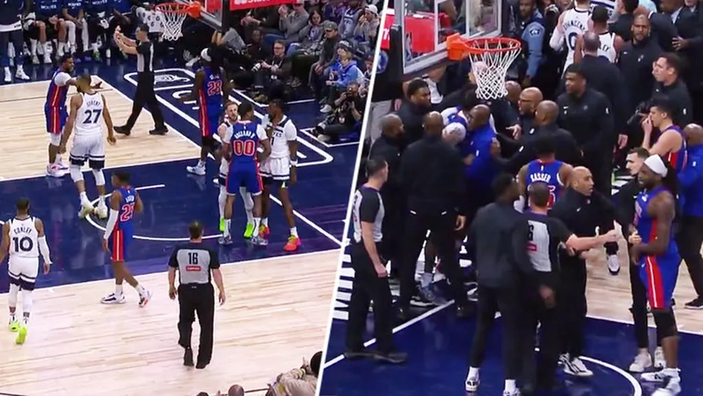 В матче регулярного чемпионата НБА между «Миннесотой» и «Детройтом» (123:104) произошла массовая драка, в которой приняли участие как игроки, так и тренеры команд.