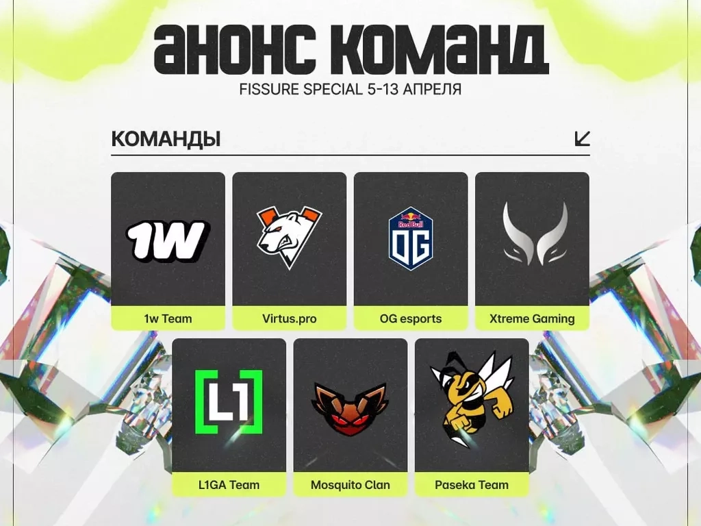 Организаторы FISSURE Special по «Дота 2» анонсировали турнир в формате Elimination Draft, а также объявили его участников. На чемпионате будут играть: Virtus.pro, OG, Xtreme Gaming, 1W Team, L1ga Team, Mosquito Clan и Paseka Team.
