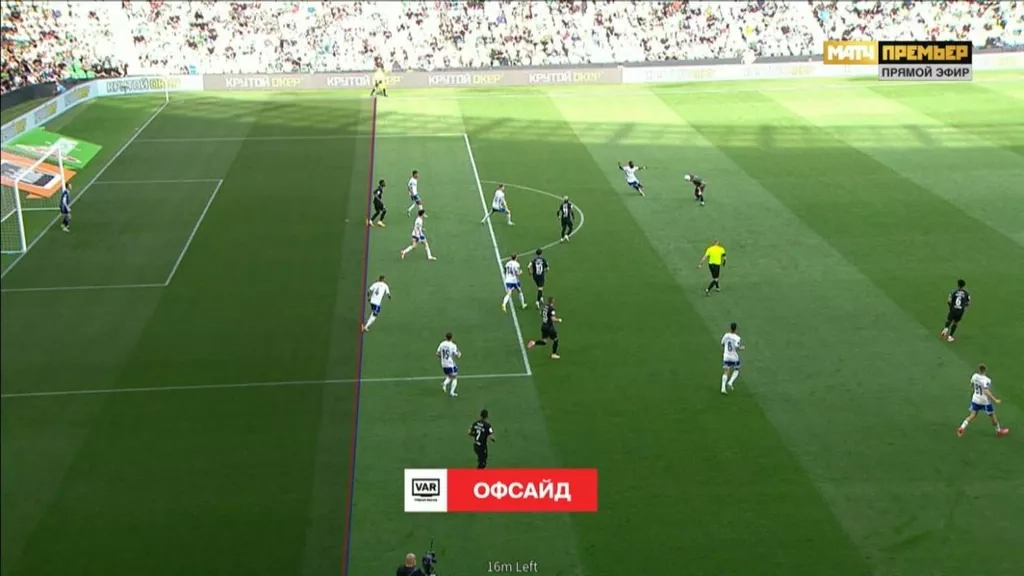 Форвард «быков» упал в штрафной площади соперника, и судейская бригада, возглавляемая Артёмом Чистяковым, приостановила игру, дожидаясь решения системы VAR. Потенциальное нарушение могло привести к назначению пенальти в ворота «Динамо». После видеопросмотра выяснилось, что Кордоба находился в положении «вне игры» до контакта, а значит, игра была остановлена бы ещё до возможного фола. Решение VAR — пенальти не назначать.