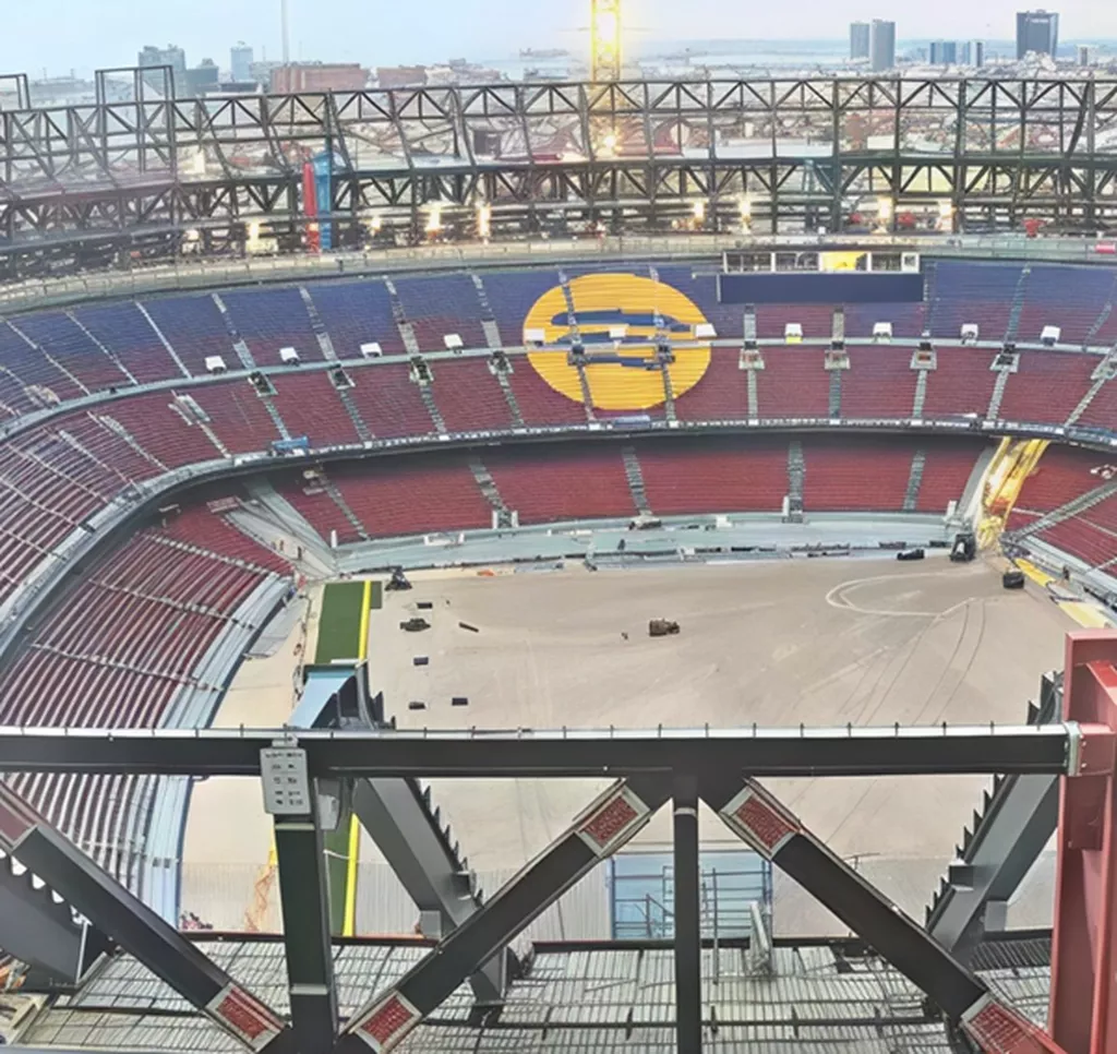 29 июля 2025 года в социальных сетях появилось фото работ на «Камп Ноу». На изображении чётко видно, что готовы только некоторые зрительские места. Рабочие только начинают укладывать газон, а монтаж кровли даже не начинается. Ранее испанское издание Relevo писало о том, что работы над крышей будут проводиться только летом 2026 года, когда будет возведён третий ярус.