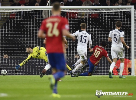 Игра началась в неспешном темпе, тем не менее, «Тоттенхэм» смотрелся лучше ЦСКА и без особых усилий взламывал оборону своего соперника. Однако, в нужные моменты выручал свою команду Игорь Акинфеев. На 33-й минуте ЦСКА несколько неожиданно вышел вперед после гола Алана Дзагоева. Этот мяч нисколько не смутил английский клуб, и он продолжил играть в той же манере, как и начинал. Через шесть минут «Тоттенхэм» смог сравнять счет после точного удара Деле Алли. Уйти на перерыв с равным счетом ЦСКА не смог. На 45-й минуте Кейн замкнул передачу от Роуза, и на перерыв команды отправились при счете 2:1 в пользу английского клуба.