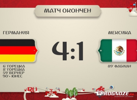Финальный свисток зафиксировал уверенную победу сборной Германии над Мексикой со счетом 4:1. В финале турнира немцы встретятся с чилийцами, а сборная Мексики за третье место сыграет с Португалией.