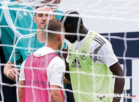 Футболисты немецкой сборной устроили потасовку на одной из тренировок. В частности, конфликтная ситуация возникла между двумя игроками сборной. В одном из игровых эпизодов произошел жесткий стык, после которого Йозуа Киммих и Антонио Рюдигер принялись выяснять отношения.