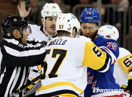 Матч регулярного чемпионата НХЛ между «Нью-Йорк Рейнджерс» и «Питтсбург Пингвинз» (3:0) завершился массовой дракой. Видео можно посмотреть здесь.