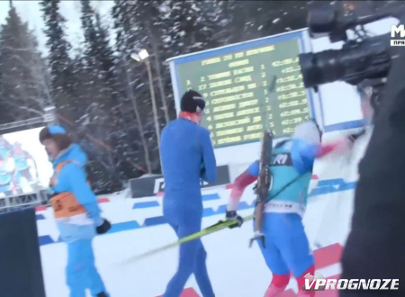 Российский биатлонист Даниил Серохвостов допустил пять промахов на дистанции, занял всего лишь 10-е место, а на финише выбросил свои лыжи.