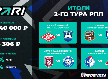 Один из самых крупных выигрышей в PARI во втором туре РПЛ пришелся на матч «Спартак» — «Балтика». Один клиент был настолько уверен в победе красно-белых, что зарядил на это два миллиона рублей по коэффициенту 1.47. Итоговый чистый выигрыш беттора составил 940 000 рублей.